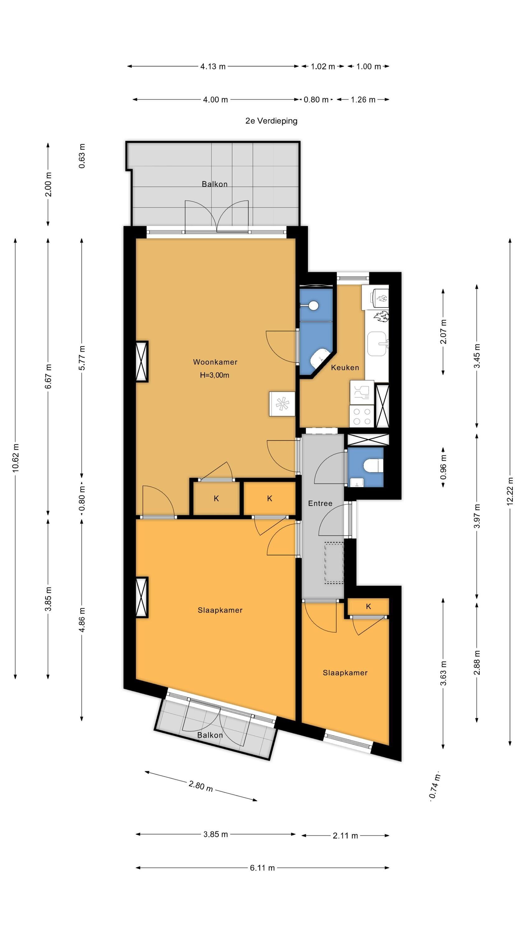 Entree, hal met apart toilet en toegang tot alle vertrekken, waaronder een separate keuken, twee slaapkamers, waarvan één met toegang tot het balkon en de woonkamer voorzien van een ingebouwde kast met toegang tot het balkon aan de achterzijde. Vanuit de woonkamer is tevens de badkamer te bereiken.